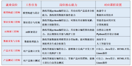 本专业的毕业生具备适应新技术发展并保持终身学习,具有高度的社会责任感、良好的职业道德;能在未来智能产品开发中承担数据采集与分析、模型构建、算法实现、软件开发等方面工作;亦可从事人工智能应用研究、产品咨询、教育工作等。