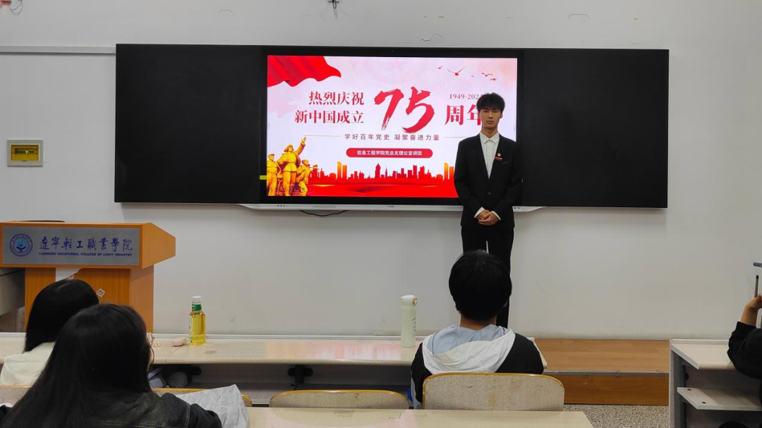 在庆祝新中国成立75周年的热烈氛围中,为使同学们深入学习党的历史,缅怀党的丰功伟绩,以更加饱满的热情和坚定的信念投身到中国式现代化的建设与发展中,太阳集团122cc党总支理论宣讲团特此开展“七十五载铸辉煌,凝聚力量续华章”主题宣讲活动。