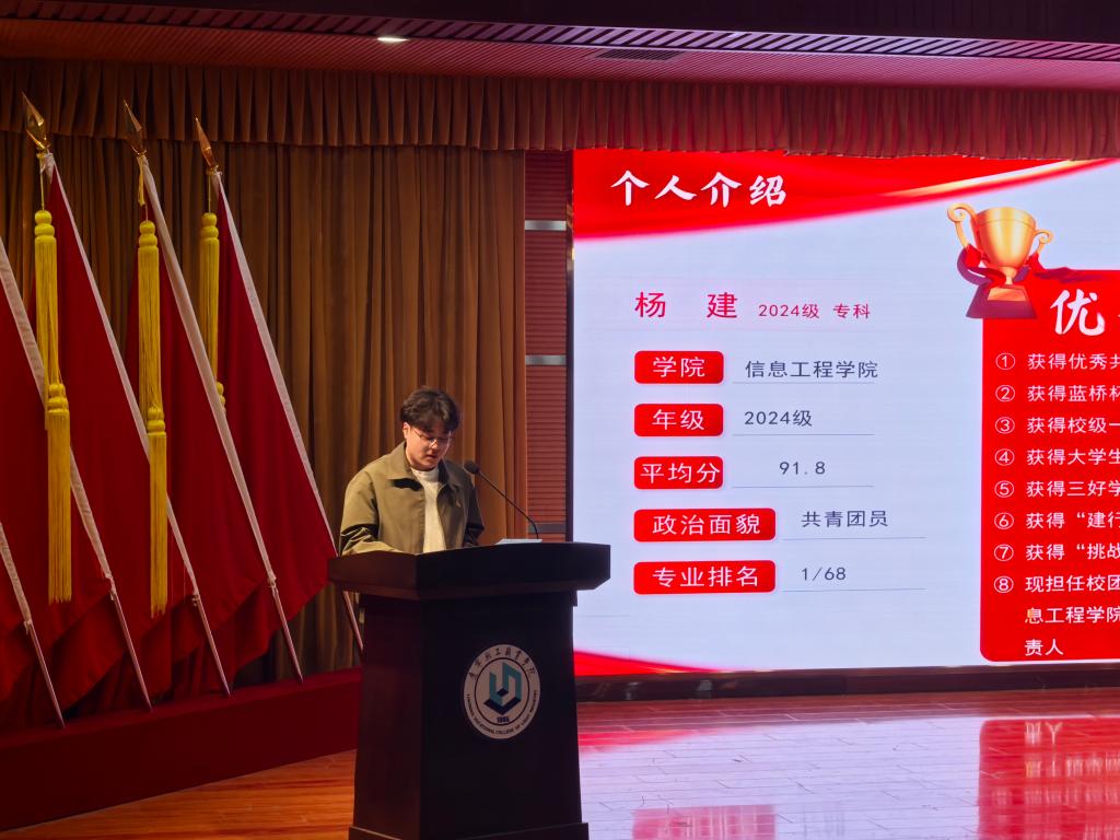 在主题分享环节,国家奖学金获得者:互联2331班马季阳,省政府奖学金获得者:大数据2332班许杰,励志奖学金获得者:互联2331班李美慧,老员工标兵获得者:电子2431班杨建,自立自强标兵获得者:物联网2432班孟维涵五位优秀员工代表轮番上台,结合自身实际情况,分享了自己在专业课程学习、学科竞赛经历、团学干部工作及社会实践活动等方面的经验和心得。他们以生动的案例、科学的方法、昂扬的斗志感染了在场的所有同学,同学们不时报以热烈的掌声。